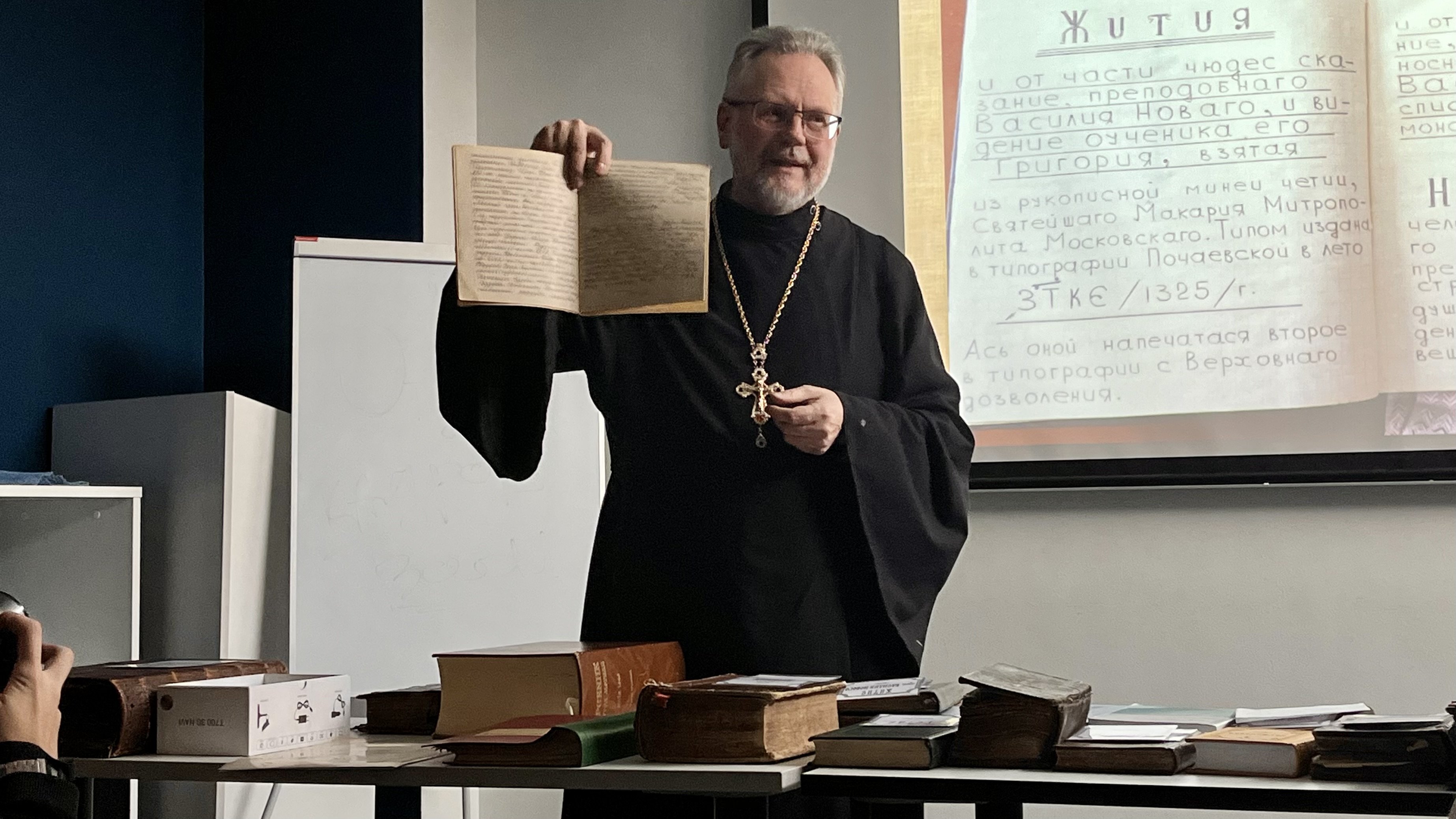 Протоиерей Тимофей Морев рассказал о богослужебных изданиях и продемонстрировал уникальные старопечатные книги.